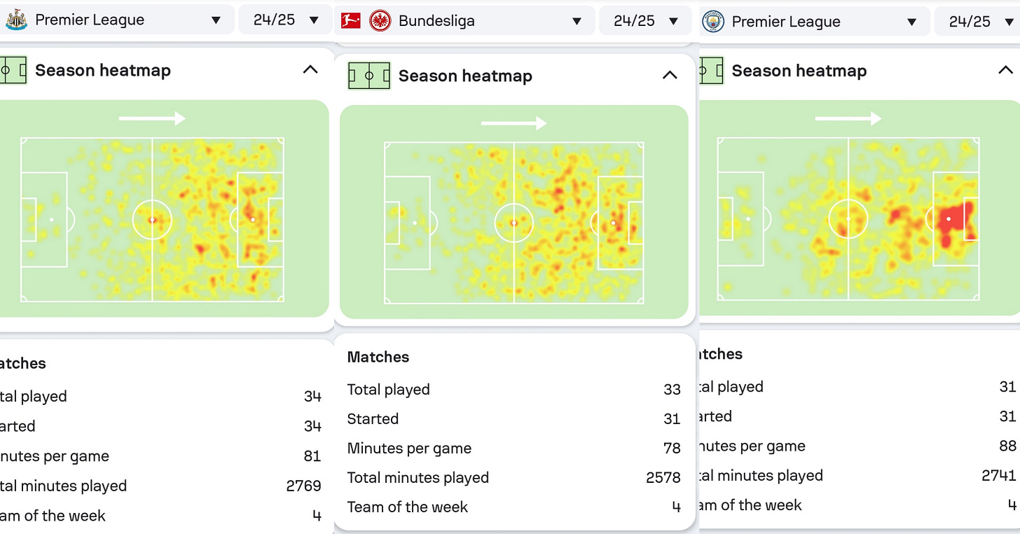 (Domestic League Season Heatmaps, from LEFT TO RIGHT: Isak, Ekitike, Haaland)