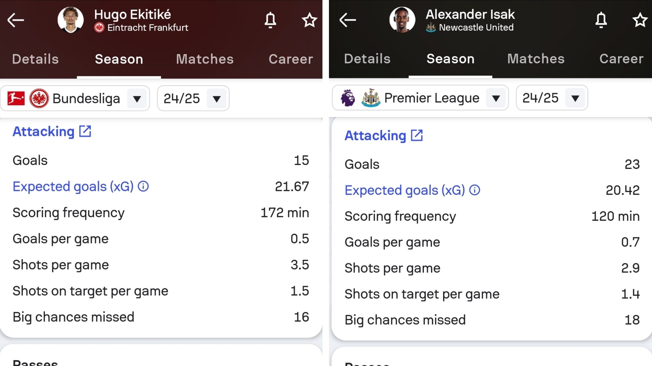(Domestic attacking stats for Hugo Ekitike and Alexander Isak for 24/25 offer some encouragement that there’s more to come from Ekitike as a goalscorer.)